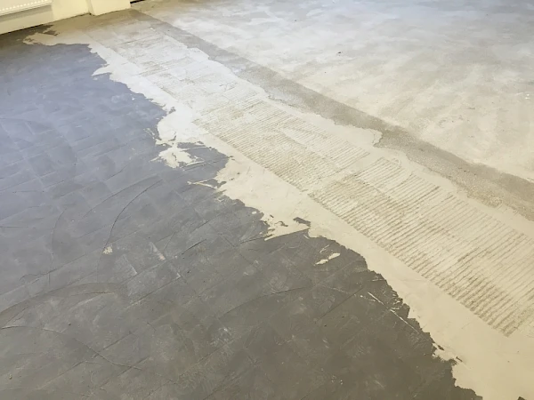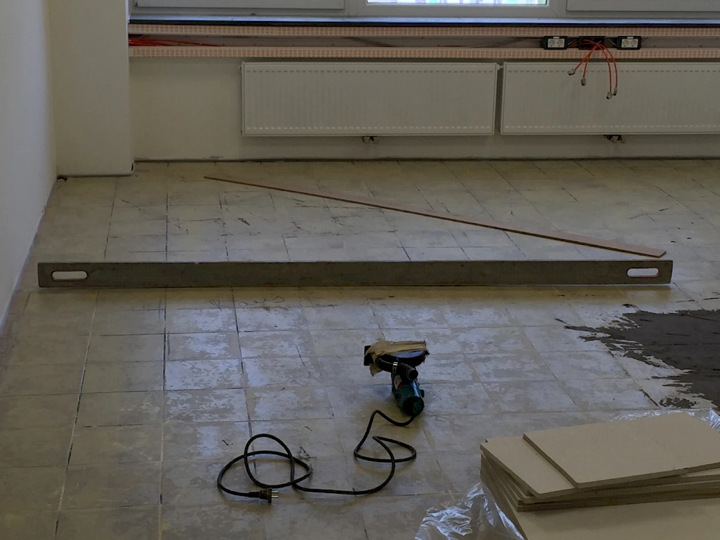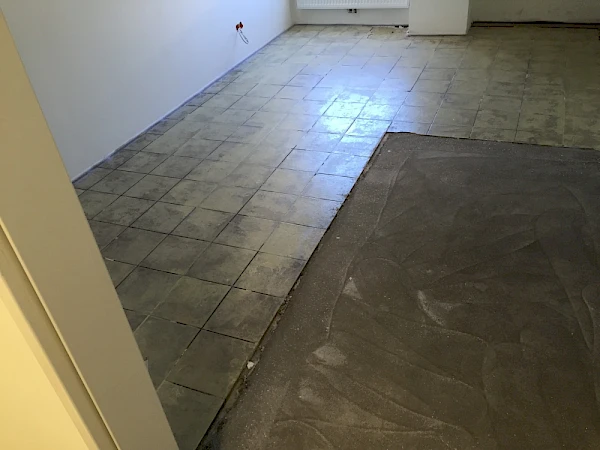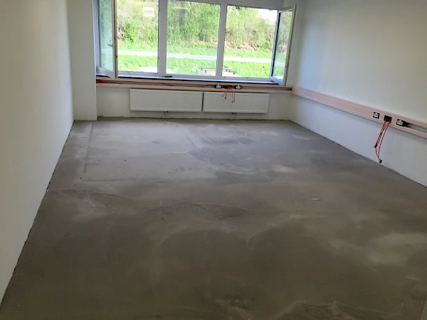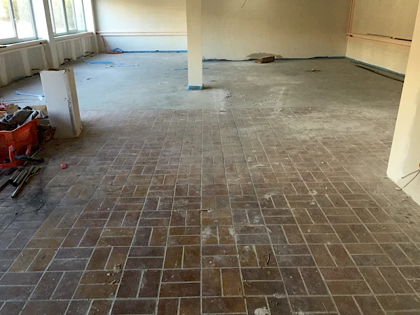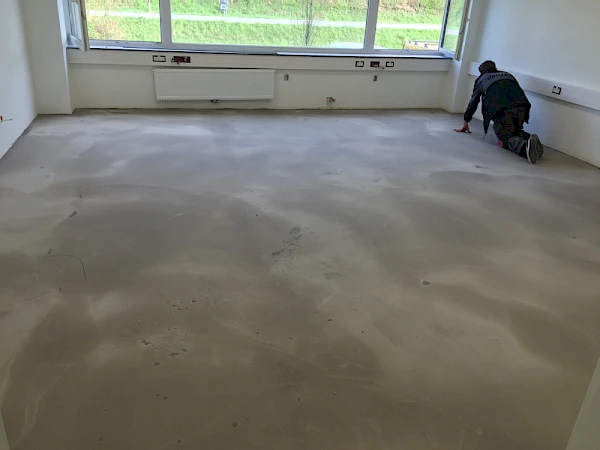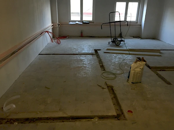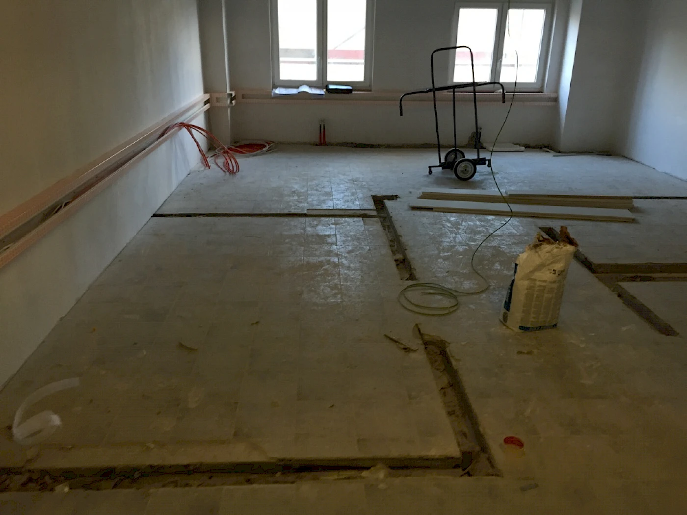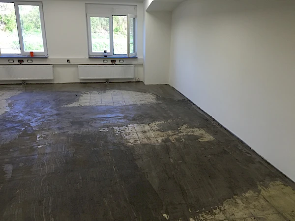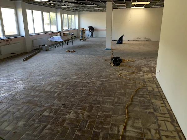 Bondensanierung eines Firmenkomplexes mit einer Gesamtfläche von ca. 550qm. Ausgleichen starker Unebenheiten und Vorbereitung eines verlegereifen Bodens.