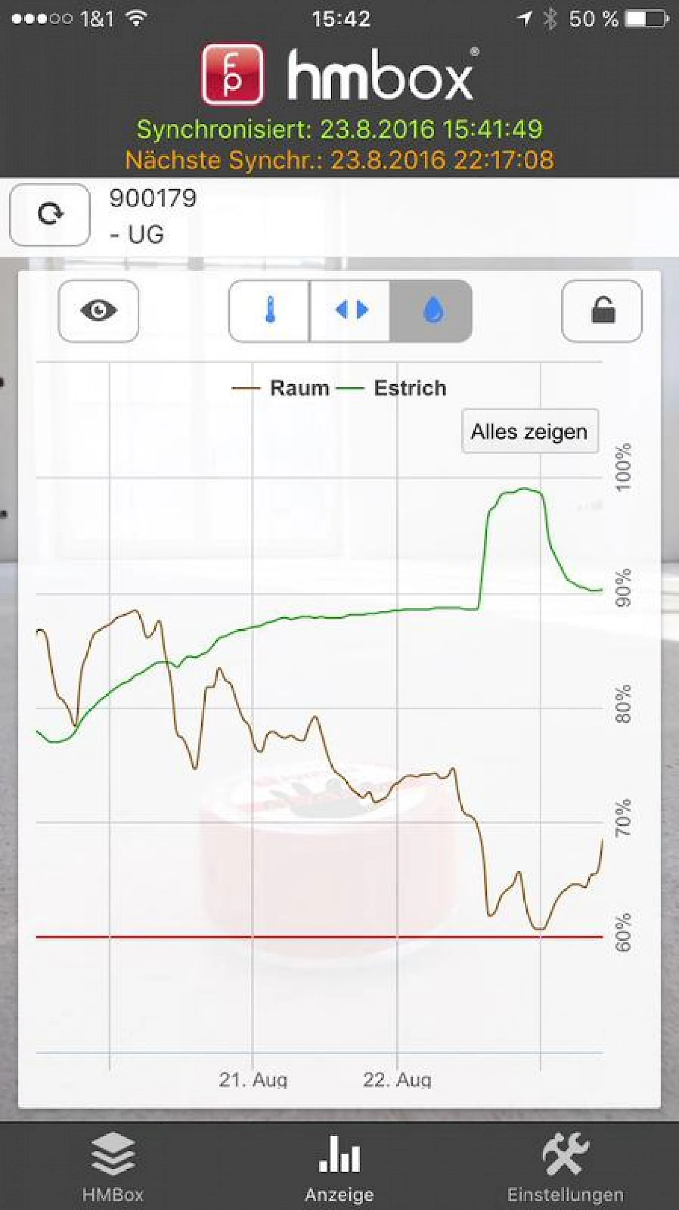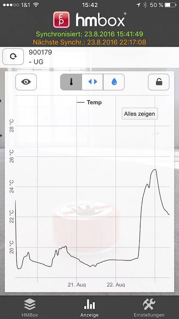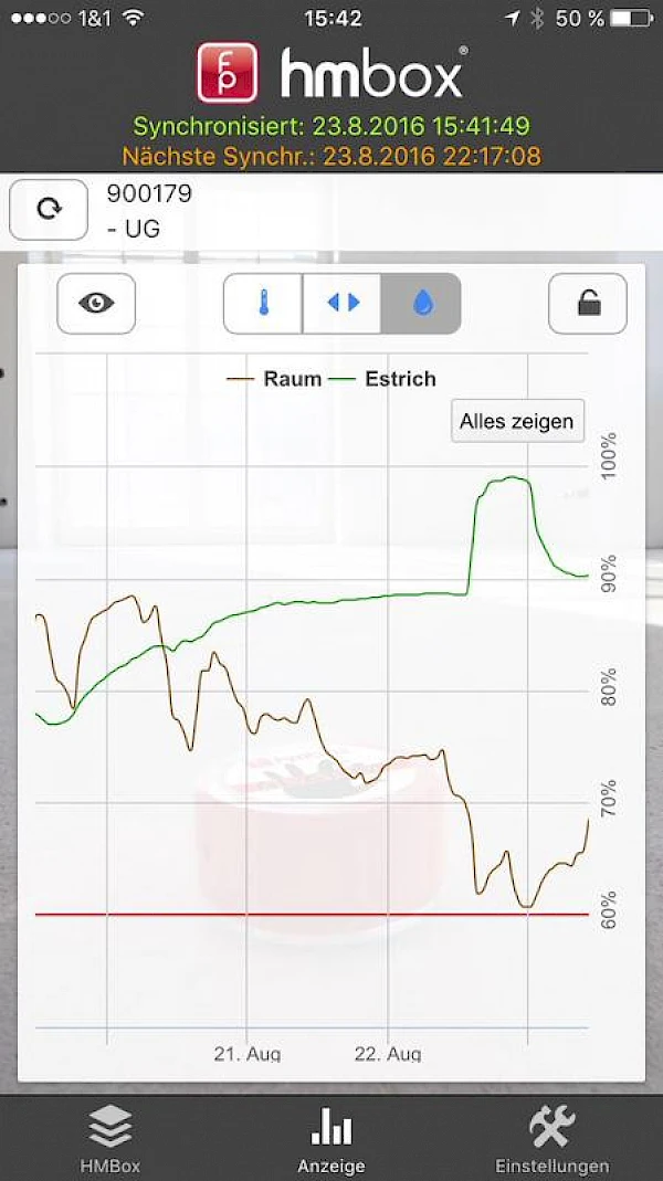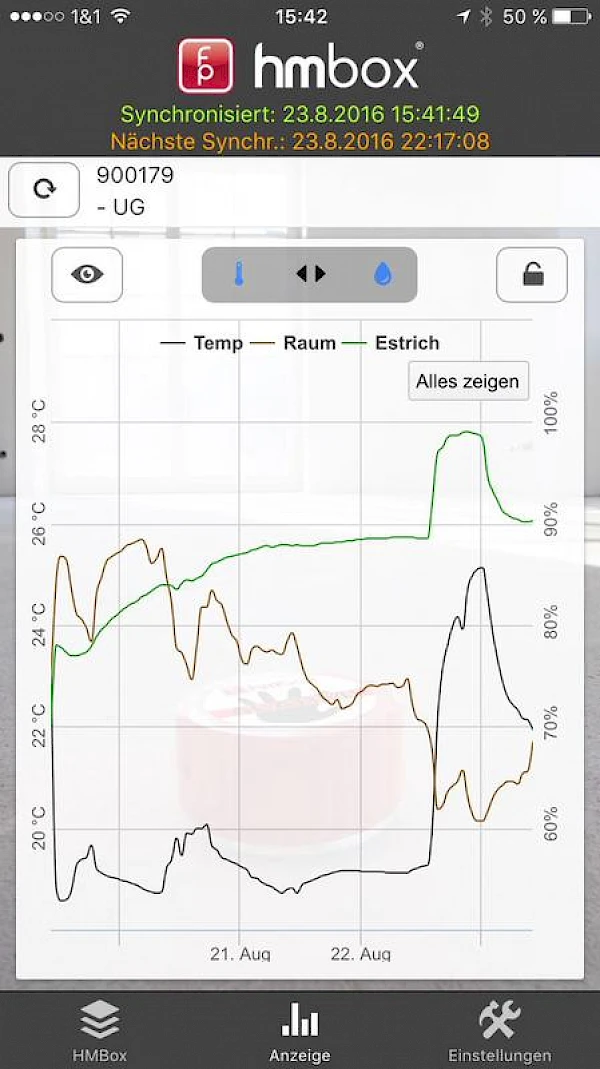 Wir erhalten verschiedene Datensätze im Zeitverlauf durch den regelmäßigen Versand der Raumdaten durch die hmbox an uns. Damit können wir die Entwicklung Ihrer Raumtemperatur, Estrichfeuchtigkeit, … grafisch über unsere Smartphone oder Desktop PC auswerten.