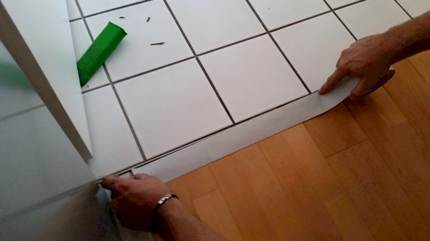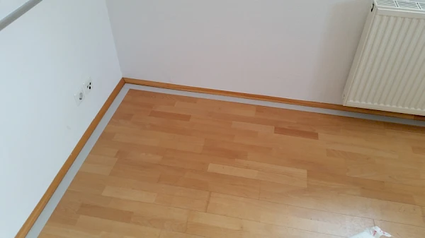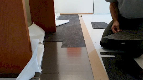 Die Herausfoderungen beim Verlegen des Vinylbodens waren u.a. ein passgenaues Anarbeiten an bestehende Holzsockelleisten und Einbaumöbel.