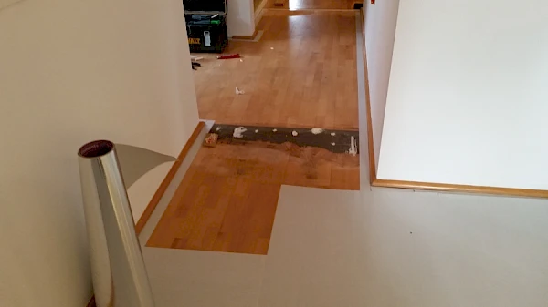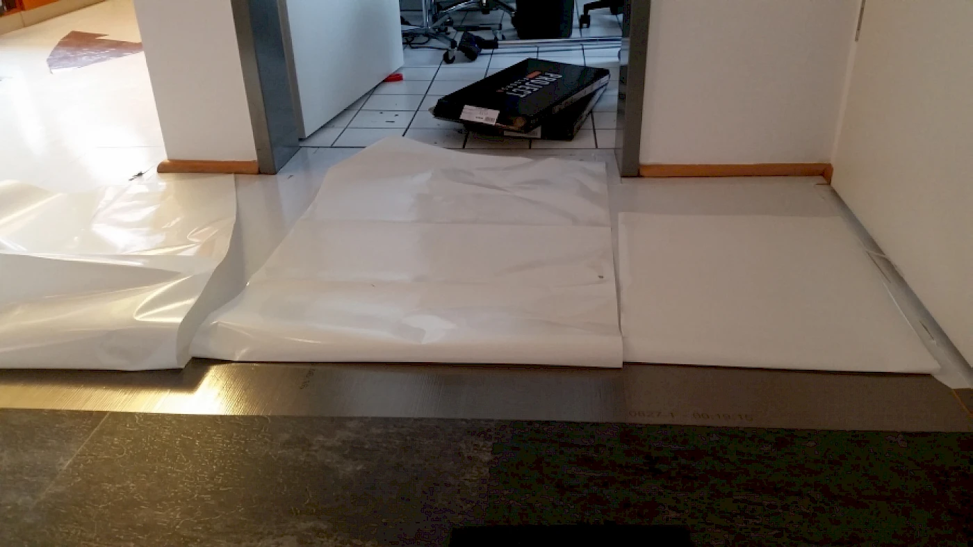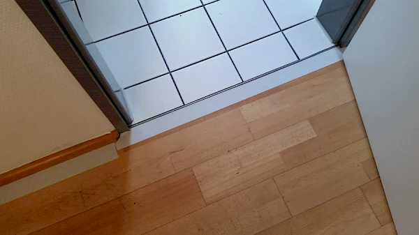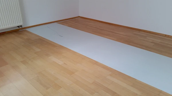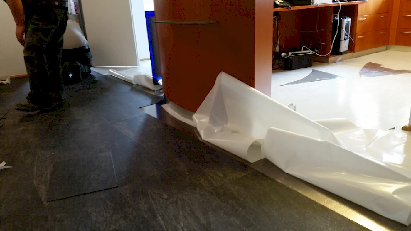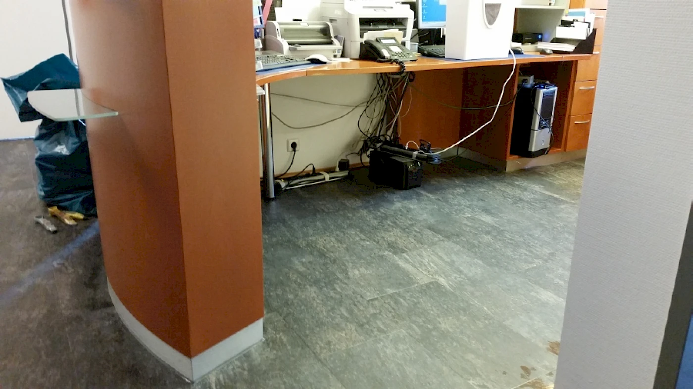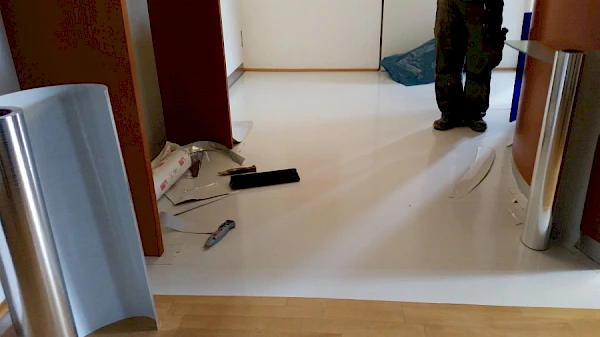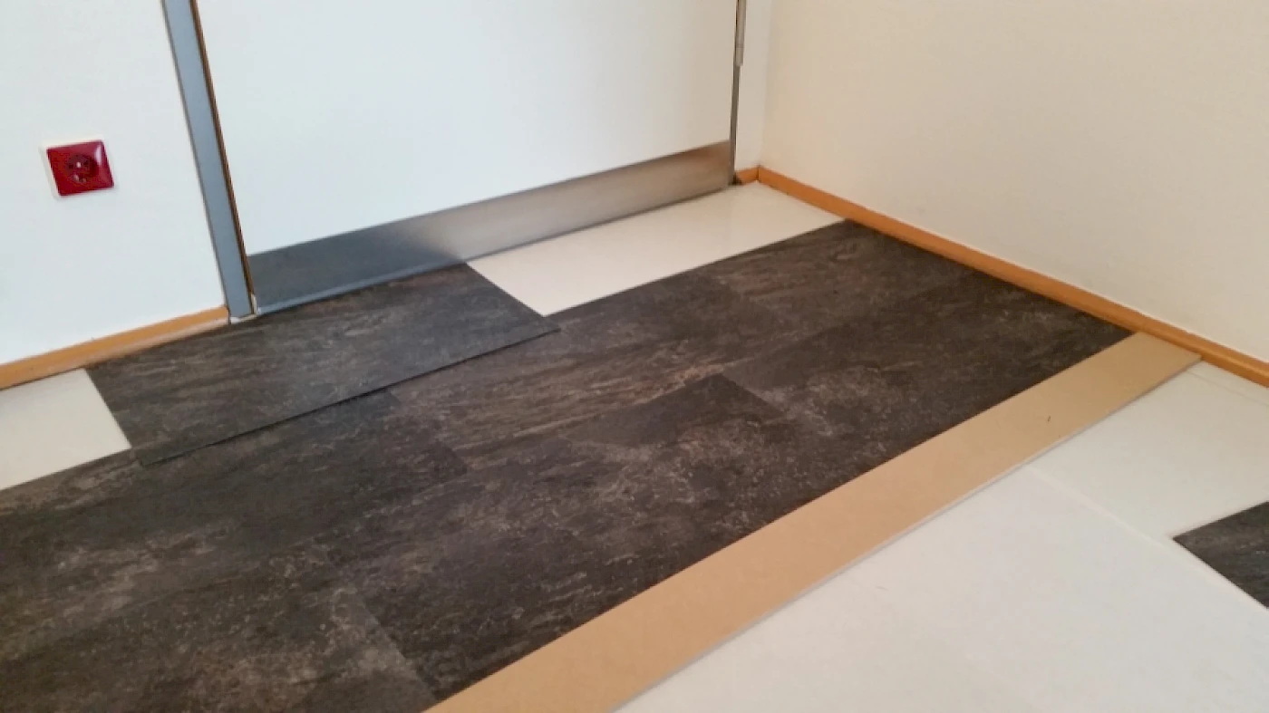 Die Arztpraxis hatte bereits zwei Bodenschichten, einen älteren Parkettboden auf dem ein PVC Designbelag gelegt wurde. Die oberste Schicht, der PVC Boden, wurde entfernt und der Untergrund (Parkettboden) für das Verlegen eines neuen Vinylbodenbelags gesäubert.