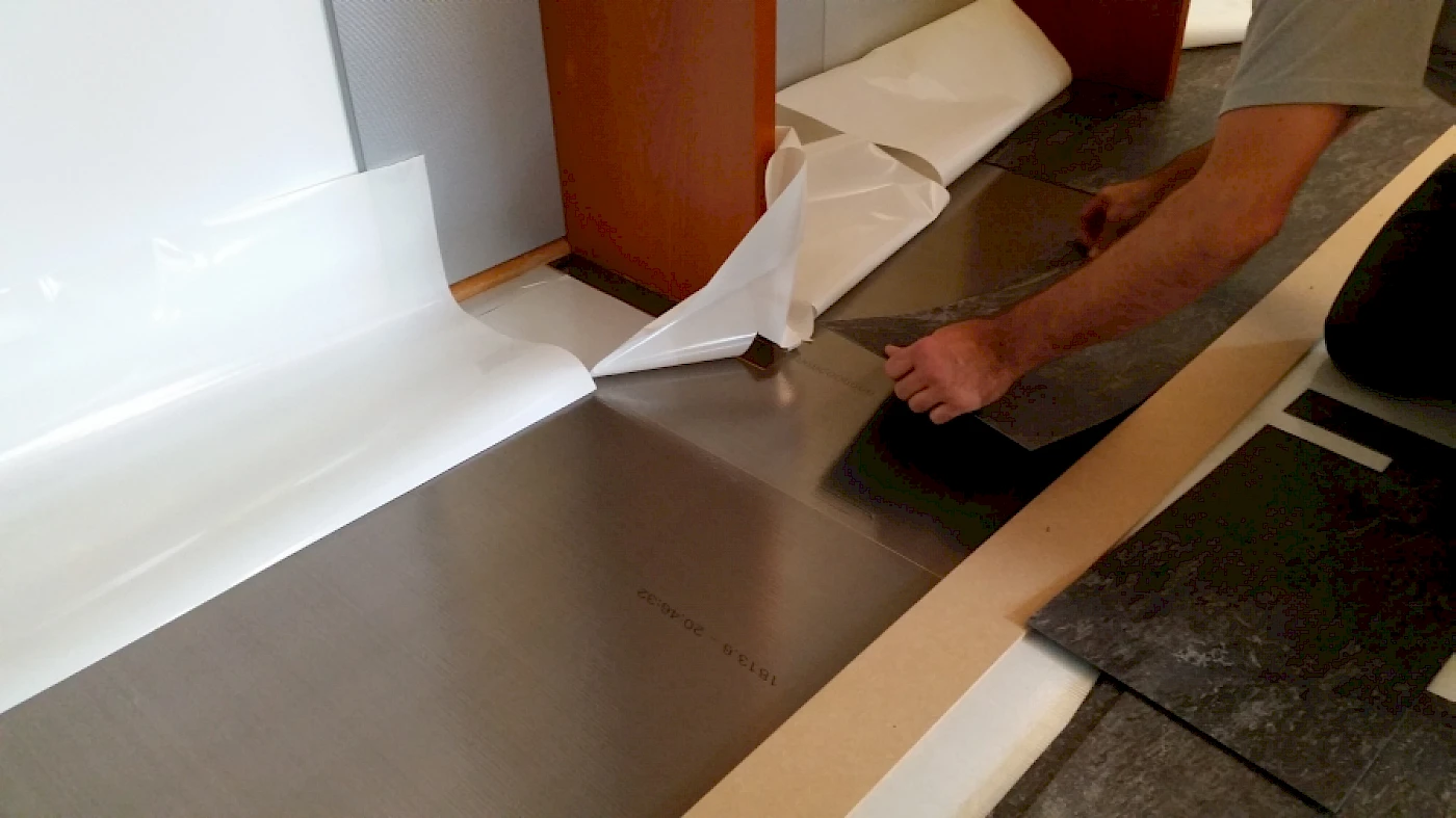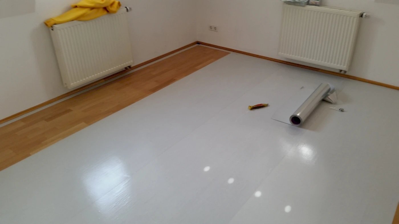 Damit der Parkettboden (Bestandsboden) geschützt wird, wurde eine sigan Elements Klebefolie verlegt. Die Klebefolie lässt sich später rückstandsfrei entfernen und macht den Bestandsboden bei Bedarf wieder nutzbar. Anschließend wurde der neue, phthalatfrei Vinylbelag von Projet Floors auf die „sigan Elements“ Klebefolie geklebt.